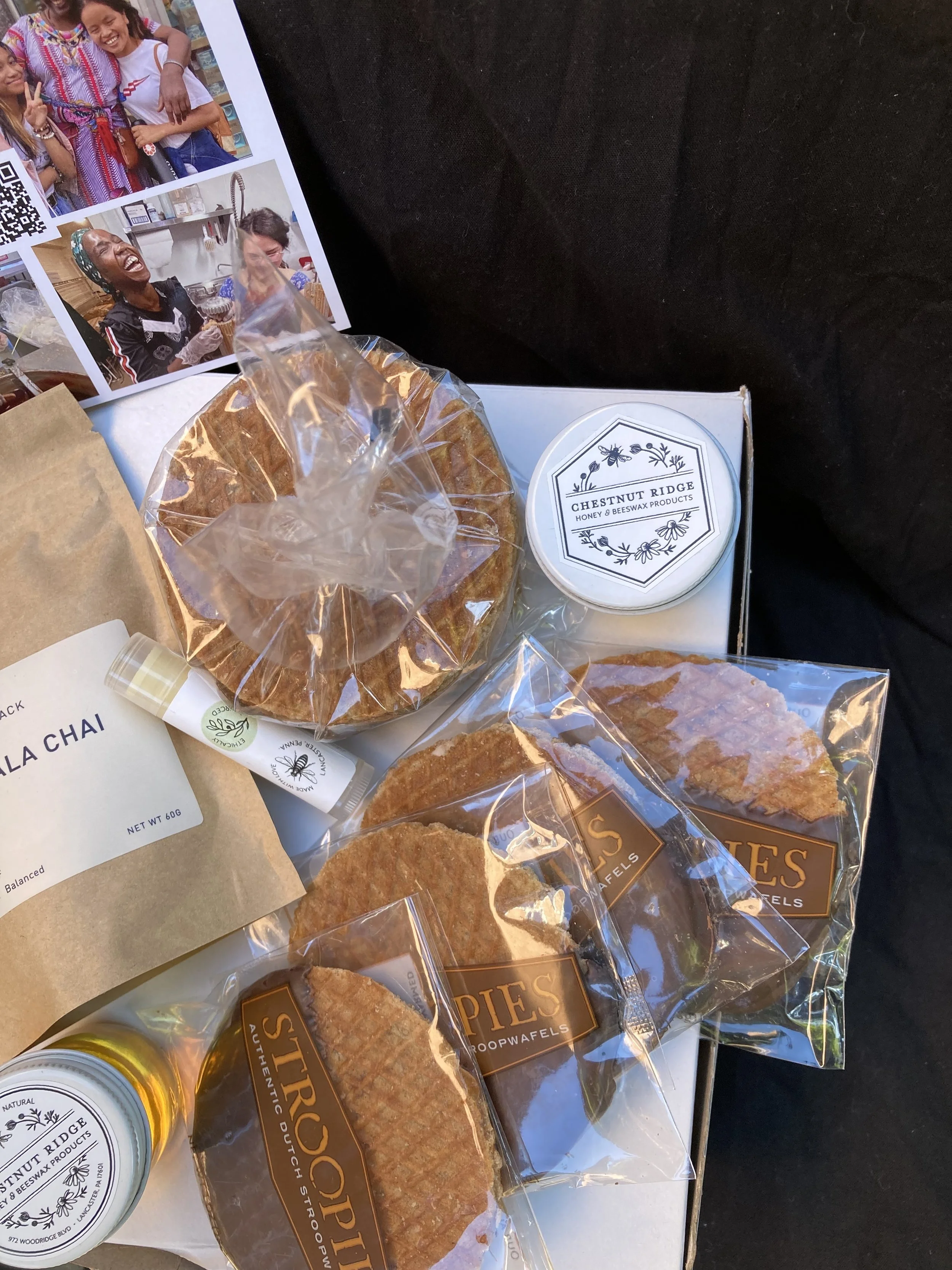 Each delicious box will have a Stroopies Traditional Gift Pack, 4 specialty stroopies (flavors will vary and sometimes will be created JUST FOR YOU!), a hot drink to enjoy with your stroopies (a variety of hot tea, coffee or hot chocolate) and a SURPRISE gift that will be ethically created and will serve to introduce you to more great companies and amazing products!